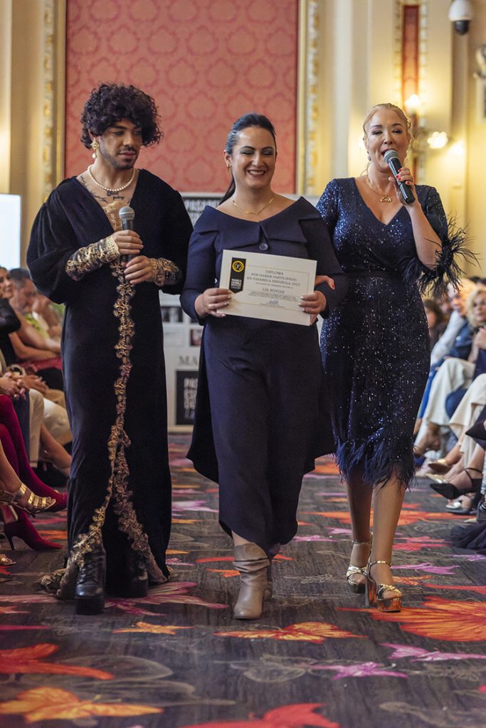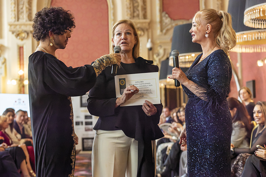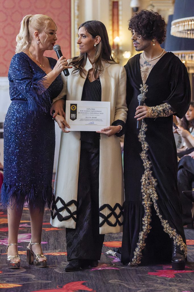 El diseñador Ian Lombardi recibiendo el diploma por su participación en Pasarela Española LimeLife 2025 junto a Susan Villa y Steven Vázquez.
