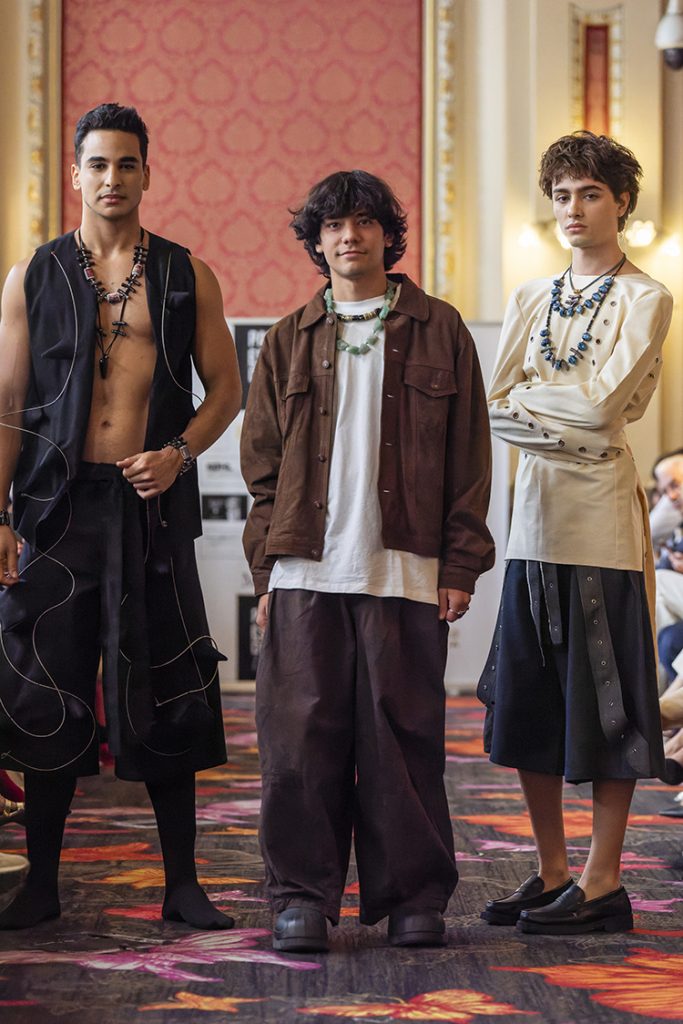La diseñadora Júlia Marí (con su firma, Silvia Marí) junto a Susan Villa y Steven Vázquez en Pasarela Española LimeLife 2025