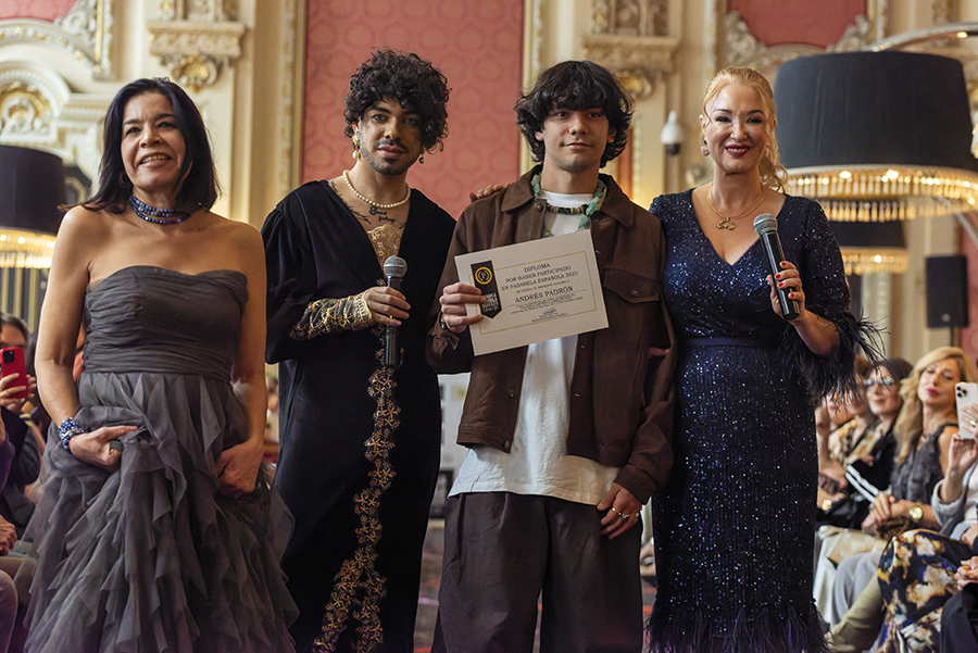 El joven diseñador Andrés Padrón en Pasarela Española LimeLife 2025 junto a Ana Barrios, Susan Villa y Steven Vázquez.