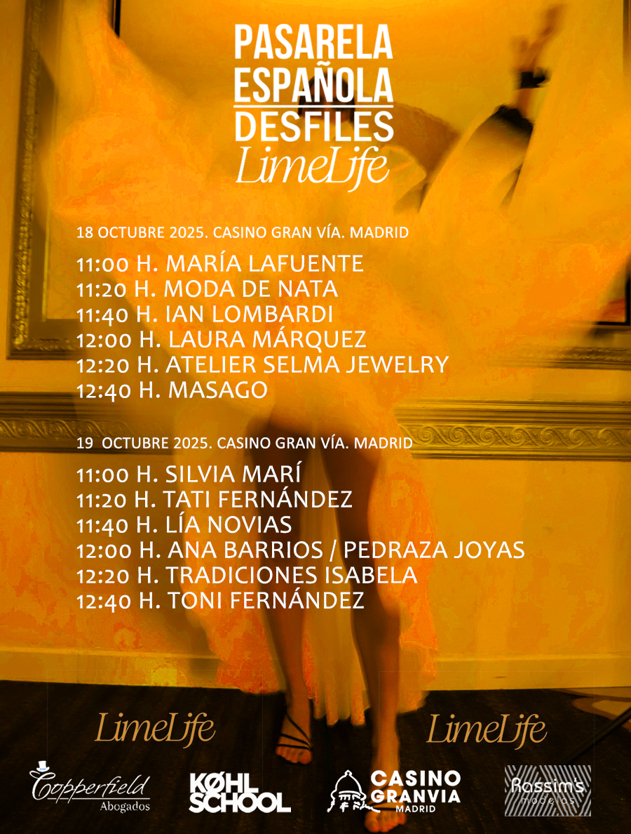 Programación y horarios desfiles Pasarela Española LimeLife 2025 Publicado el octubre 9, 2025 Por Pasarela Española Tweet Share Plus One Pin it Programación y horarios desfiles Pasarela Española LimeLife 2025 18 y 19 de octubre 2025 CASINO GRAN VÍA MADRID ¡¡ GRACIAS A TODOS !! Explore: Programación Pasarela Española Limelife 2025 Navegación de entradas Next ArticlePrevious Article